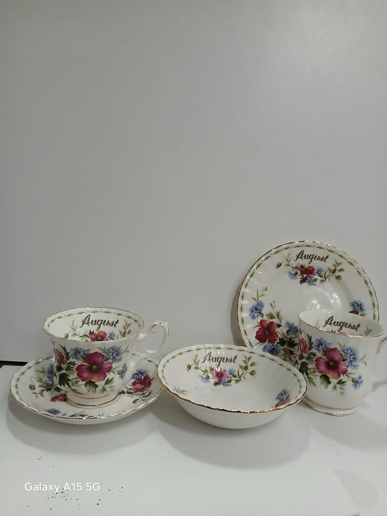 Prachtig royal albert servies, onderdeel van de ‘months of the year’ serie. Dit is de ‘augustus’ set, met mooie bloemmotieven. Bestaande uit een kop en schotel, een bord en een kom. Id