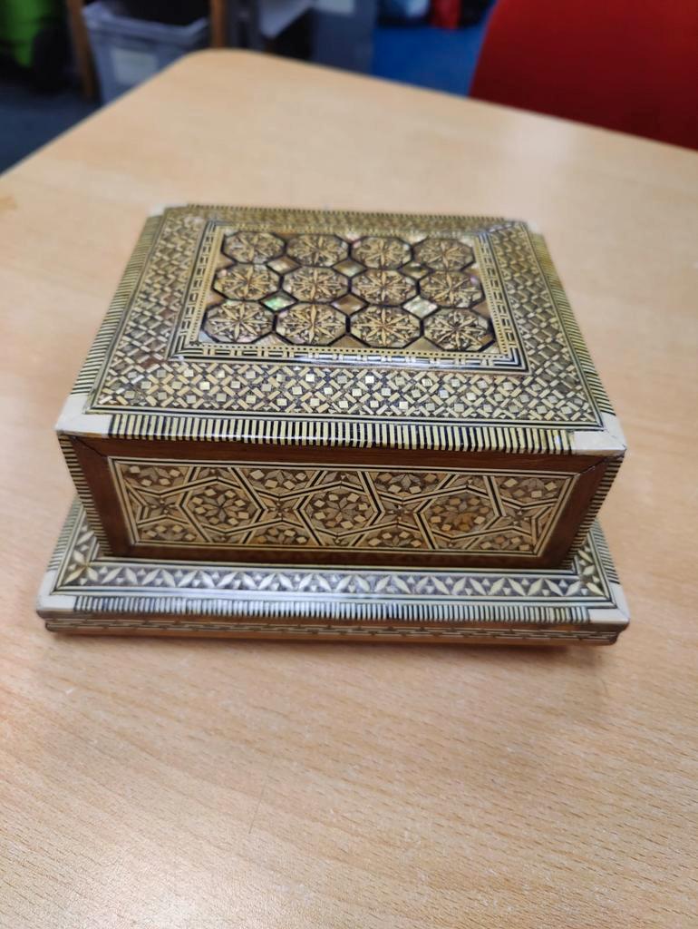 Handgemaakte sigaretten-/muziekdoos. Waarschijnlijk uit egypte. Ingelegd parelmoer/been. 17X20x10 cm. 3 Pootjes ontbreken.