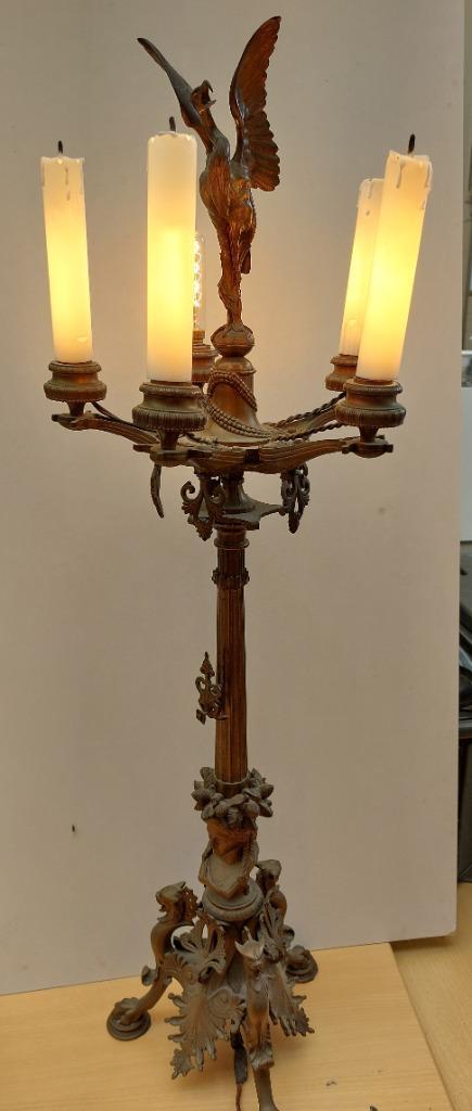 Ntiejke bronzen kandelaar met vogel hoogte 95 cm breedte 20 cm inclusief 5 lampjes 3 stuks overzet kaarsen 1kapot ovrezet kaars 1