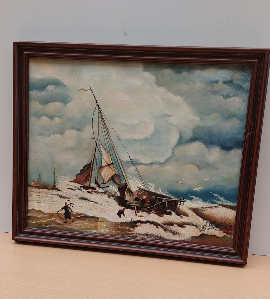 Schilderij van h.j.v.d. Heijden boot in storm gesigneerd ingelijst afm lijst 56×46 cm afm doek 49 x39 cm afhalen mogelijk na afspr