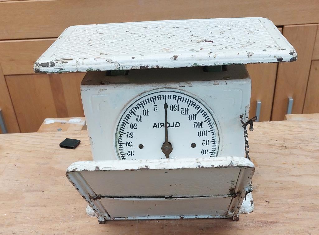 Antieke gloria personen weegschaal jaren’30, wijzerplaat in spiegelbeeld. Weegvermogen tot 125 kg spiegel is gescheurd hoogte 20 cm breedte 28 cm diepte 18 cm ziet er als veel gebruikt uit. Alleen
