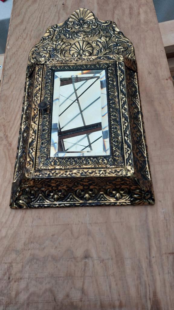 Mooie antieke halspiegel met kopere beslag incl 2 borstels houten achterwand afm. 50 X 26 x 8 cm af te halen na afspraak via mail